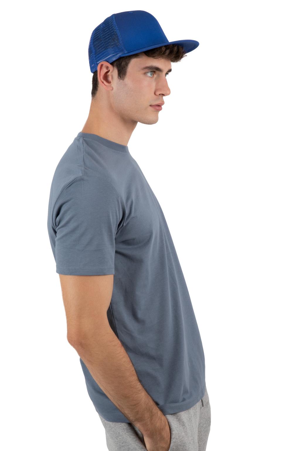 Casquette 6 panneaux 100% coton et filet 100% polyester. Visière plate. Bande de transpiration doublée en coton. Languette de réglage en plastique.