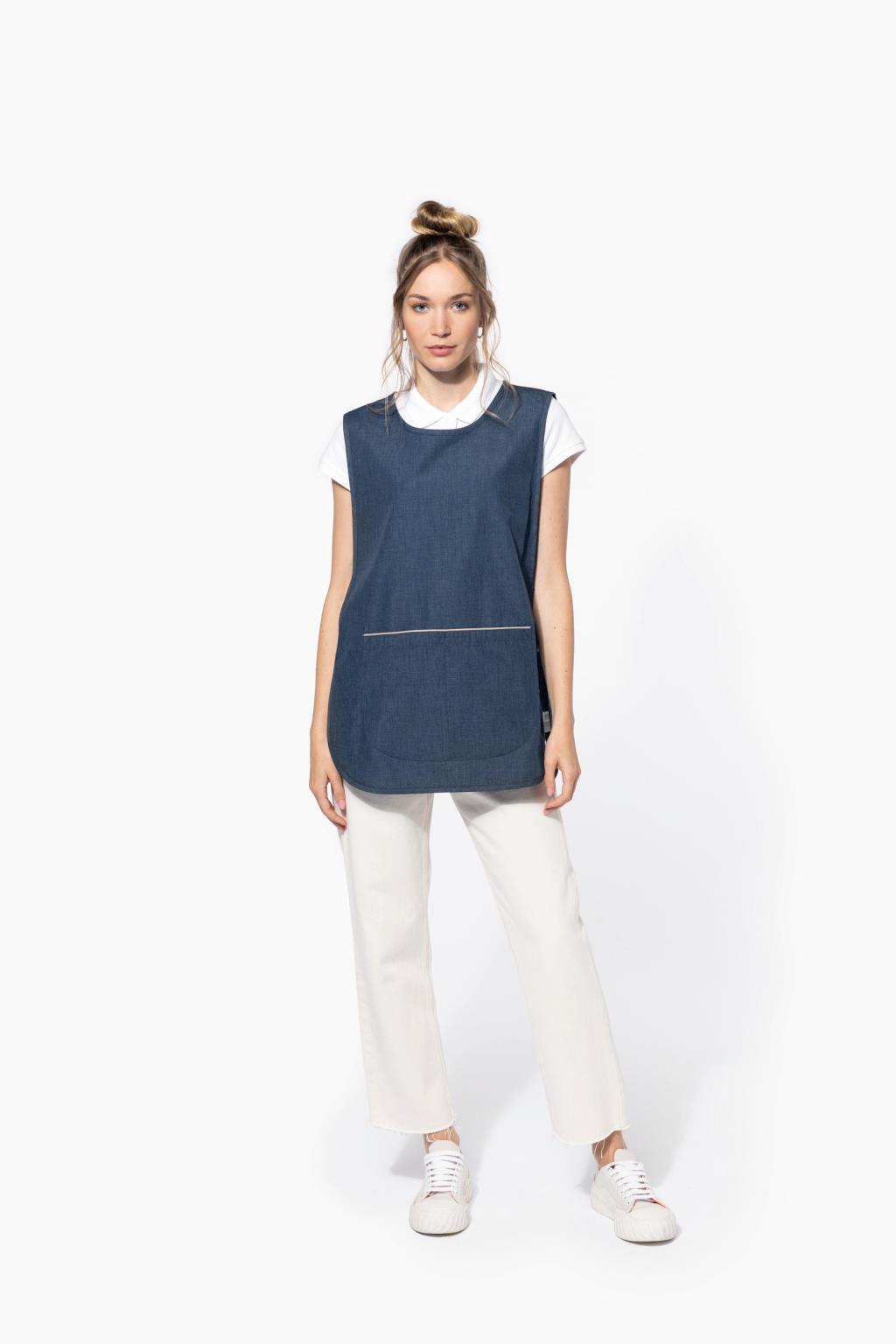 65% polyester / 35% coton. Lavage à 60°C. Tissu résistant et coupe standard. Grande poche devant en 2 compartiments avec 1 petite poche intérieure. Pattes de réglage latérales par 2 boutons pression. Liseré contrasté haut de poche. 1 étiquette nom à l'intérieur. Bas arrondi. Longueur taille L/XL: 78 cm.